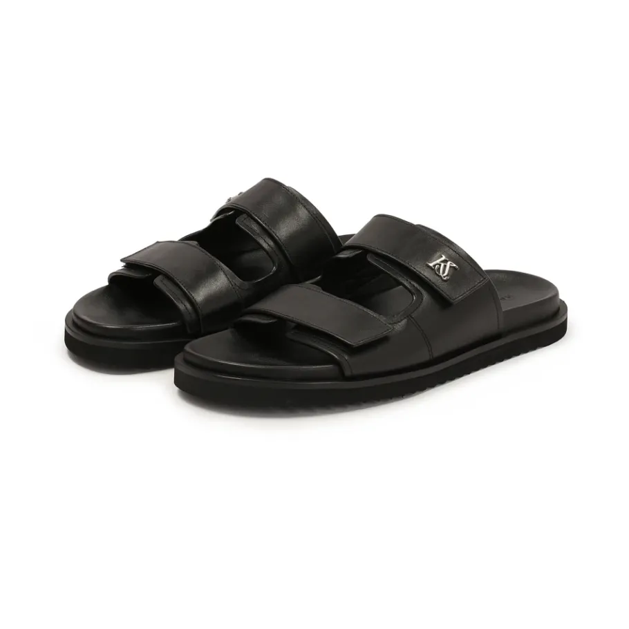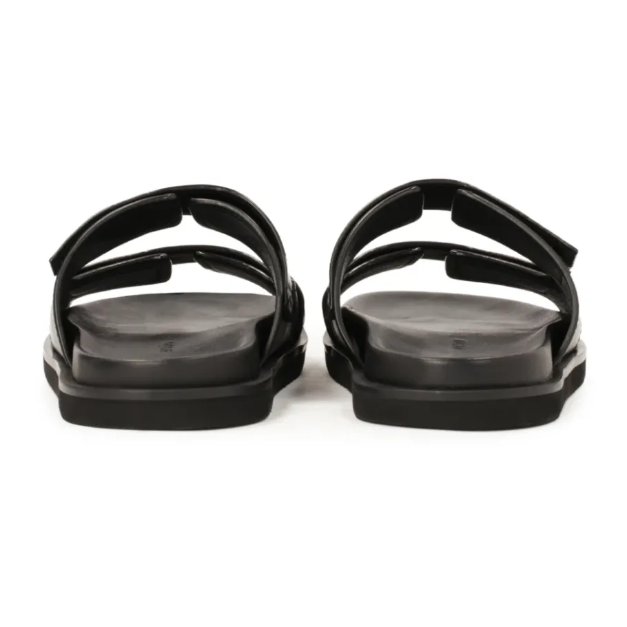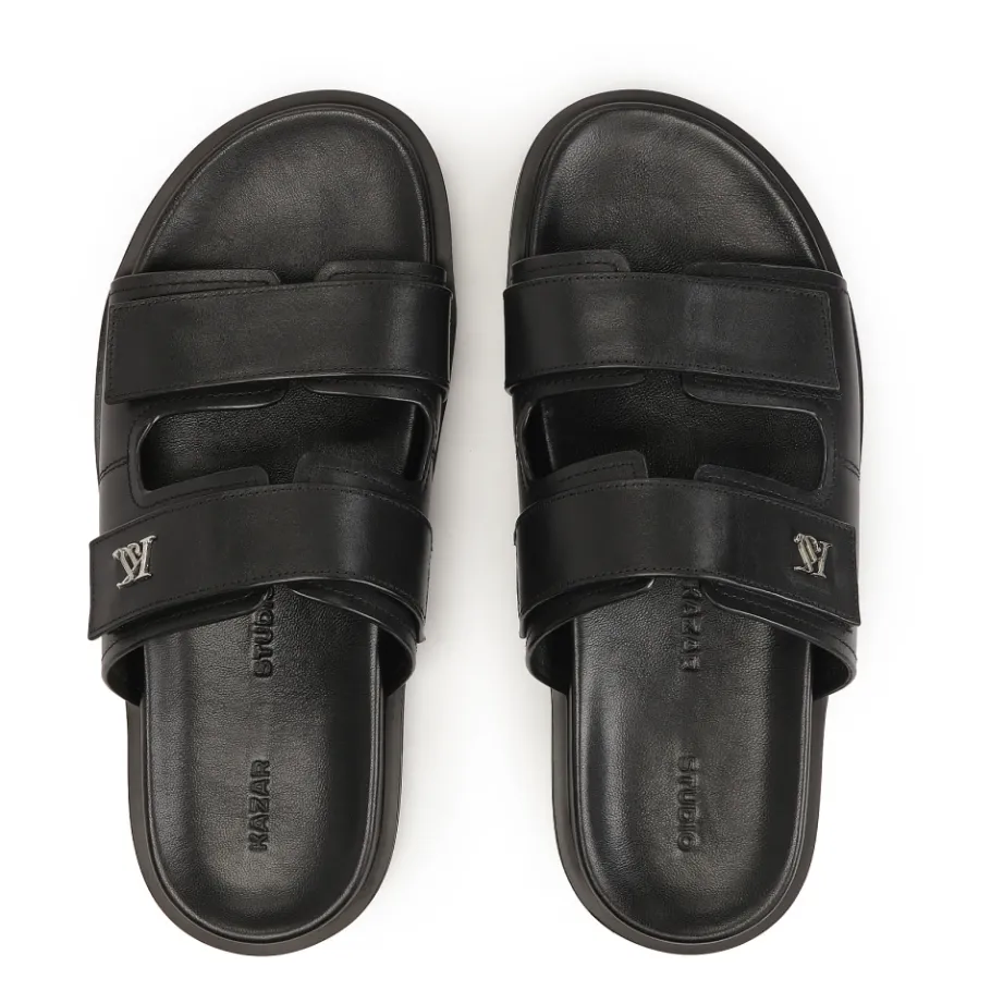 Zwarte teenslippers gemaakt van hoogwaardig natuurlijk leer combineren minimalisme met een gedurfd streetwear-touch. Geïnspireerd door het iconische ontwerp hebben ze twee brede banden met een subtiel zilveren KAZAR STUDIO-logo, wat verfijnde elegantie en originaliteit toevoegt. De dikkere, voorgevormde zool accentueert de massieve uitstraling van de teenslipper, terwijl hij comfort en een onderscheidende stijl biedt. Perfect voor mannen die klassiekers waarderen in een moderne, stedelijke editie. Deze teenslippers zijn niet alleen een accessoire, maar ook een opvallend element van elke styling. De voering van zacht natuurlijk leer, gekenmerkt door uitstekende vochtopname, garandeert een hoog comfortniveau.