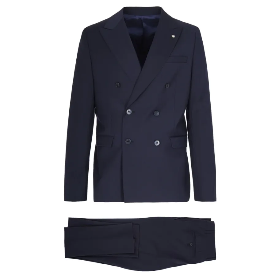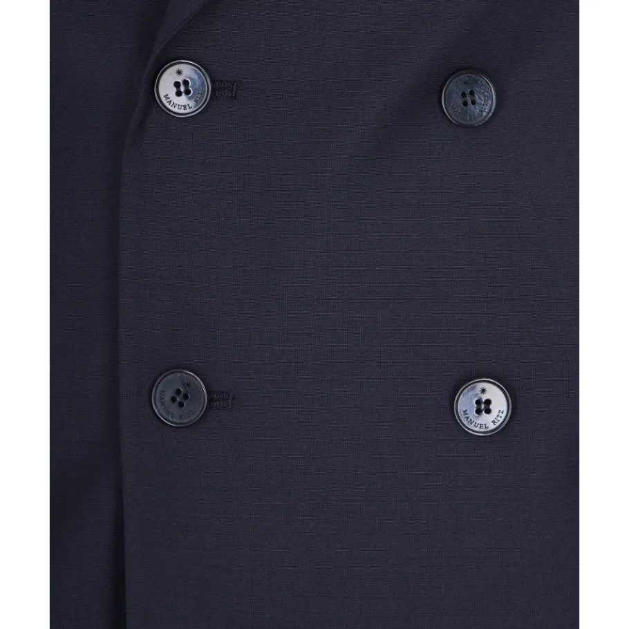Manuel Ritz double-breasted pak, vervaardigd uit een polyester-wolmix, ontworpen voor formele gelegenheden en afgestemd op een gestructureerd, verfijnd silhouet. Belangrijkste kenmerken: Blauw | Polyester | Lichte stretch | Double-breasted sluiting | Gevoerd | Double-breasted silhouet | Samenstelling & verzorging: 54% Polyester | 44% Wol | 2% Elastan | Voering: 100% Viscose | Uitsluitend chemisch reinigen.