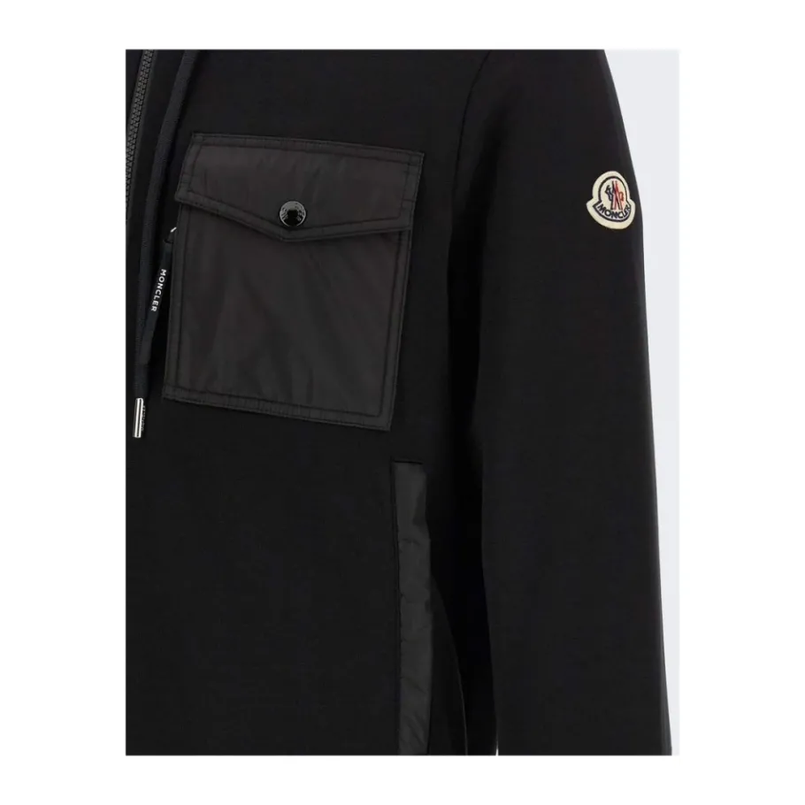 De Moncler Zip Up Cardigan combineert lichtgewicht katoen French terry met nylon details op de borst en een capuchon voor veelzijdige, dagelijkse layering. Belangrijkste kenmerken: Black | Zwart | Katoen | Lichtgewicht katoen French terry | Geborstelde binnenkant | Tweewegritssluiting | Capuchon met trekkoord | Borstzak met rits | Paspelzakken aan de zijkant | Nylon borstpaneel | Geribde manchetten en zoom | Lange mouwen | Logo patch in dezelfde kleur op de mouw | Afmetingen & pasvorm: Regular fit | Valt normaal qua maat | Samenstelling & verzorging: 87% katoen | 13% polyamide