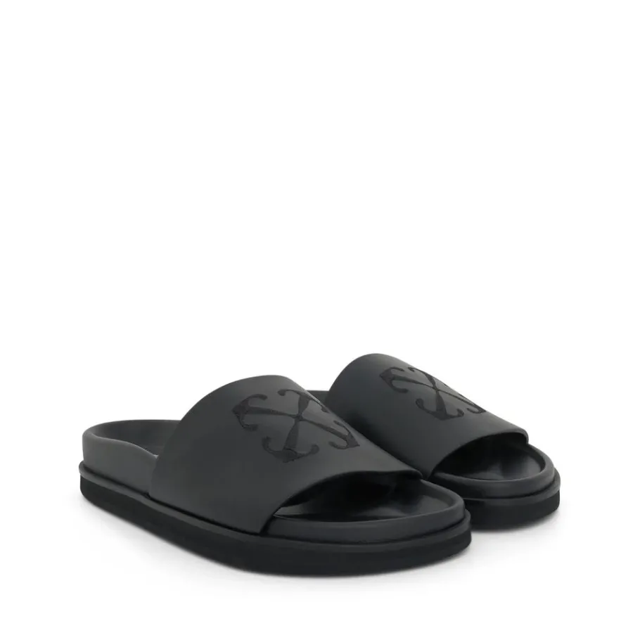 De Off-White Rubber Slippers combineren een strak silhouet om in te schuiven met een voorgevormd voetbed voor comfortabel dagelijks gebruik. Ideaal voor casual gebruik bij warm weer. Belangrijkste kenmerken: Zwart | Rubber | Instapmodel | Voorgevormd voetbed | Ronde neus | Open teen | Gladde leren afwerking | Kenmerkend Arrows-motief | Gemaakt in Italië | Samenstelling & verzorging: 100% rubber | Binnenzool: Leer | Zool: Rubber