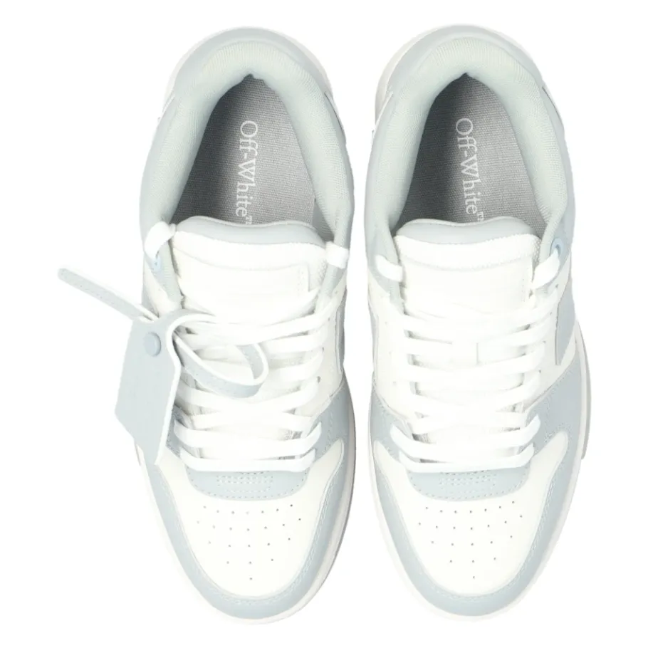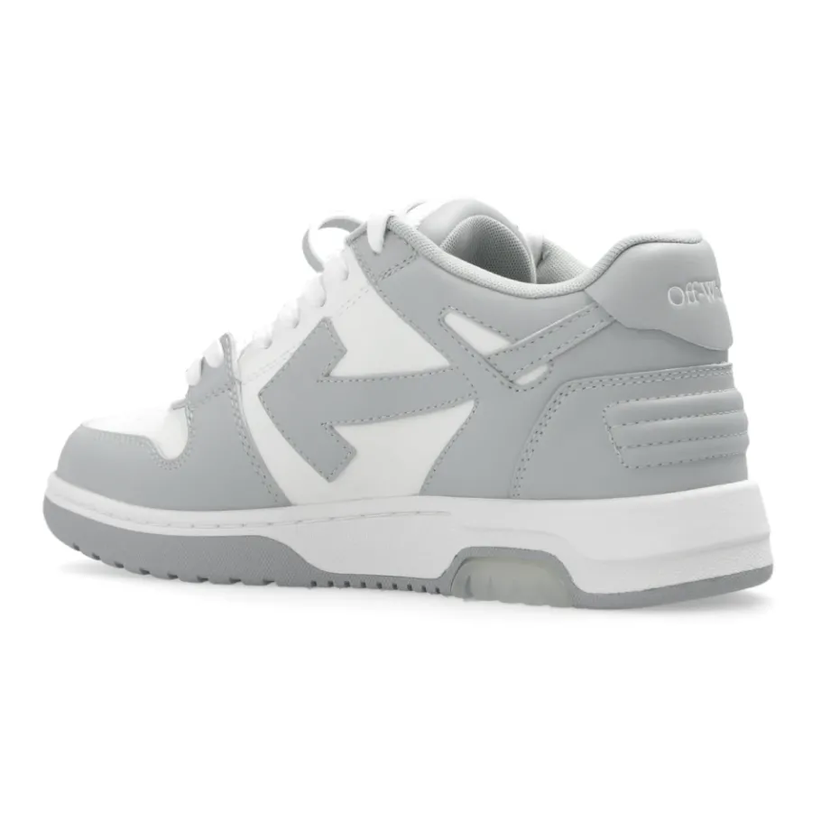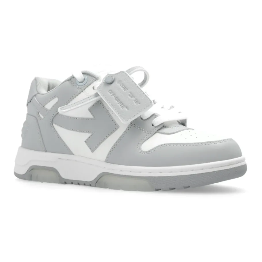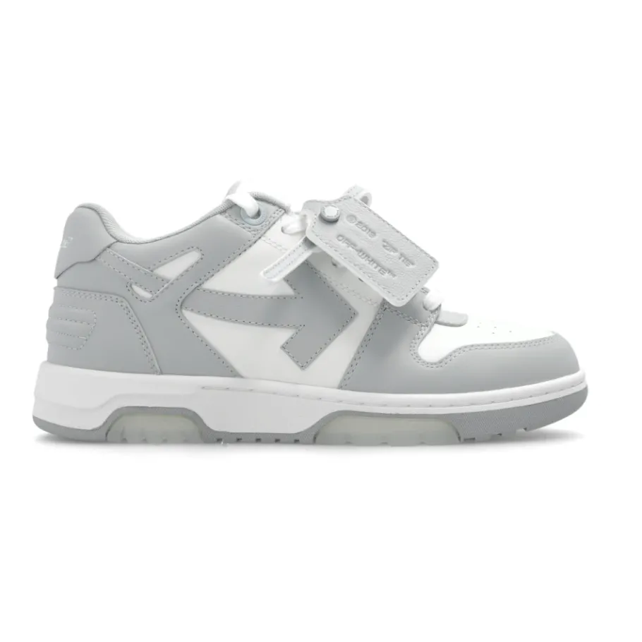 Witte en grijze ‘Out Of Office’ sneakers van Off-White. Gemaakt van kalfsleer met stoffen afwerking, dit paar met vetersluiting heeft een geperforeerde voorkant, de kenmerkende pijl van het merk, tongpatch, reliëflogo aan de achterkant, afneembaar ritsetiket en rubberen zool in wit en grijs met transparante inzetstukken. Zoolhoogte: 2,5 cm Zoolhoogte op het hoogste punt: 3,5 cm
