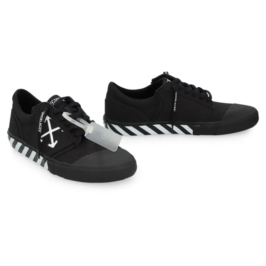 De Off-White Vulc Undercut Sneakers combineren een klassiek canvas silhouet met lage bovenkant met het kenmerkende Arrow-motief van het label en een opvallende zwart-witte diagonale gevulkaniseerde buitenzool. Designer ID verschijnt gewoonlijk als OMIA2A2F25FAB001_1001 in retailer listings. Belangrijkste kenmerken: Zwart | Off white | Katoen | Vetersluiting | Gevulkaniseerde rubberen zool | Rubberen neus | Verwijderbaar PVC merklabel | Arrow-logo detail aan de zijkant | Zwart-wit gestreepte rubberen buitenzool met diagonale strepen | Ronde neus met rubberen neus | Samenstelling & verzorging: 100% katoen | 100% rubber | Raadpleeg de instructies van de fabrikant.