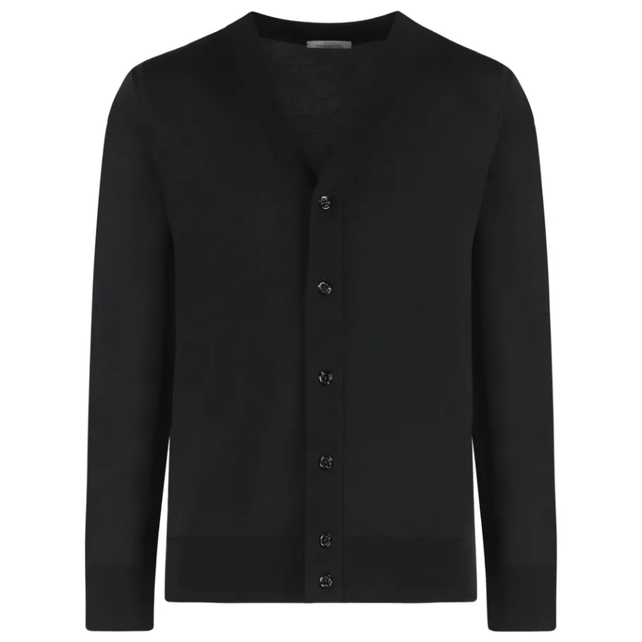 De Paolo Pecora Virgin Wool Cardigan is een klassiek V-halsgebreid vest, ontworpen voor veelzijdige laagjes. Gemaakt van wol, is het zowel geschikt over een overhemd voor een verzorgde look als over een T-shirt voor dagelijks gebruik. Belangrijkste kenmerken: Zwart | Wol | Knoopsluiting | V-hals | Lange mouwen | Geribbelde gebreide randen | Afmetingen & pasvorm: Regular fit | Samenstelling & verzorging: 100% wol | Handwas of stomerij. Niet bleken. Niet in de droogtrommel. Warm strijken indien nodig.