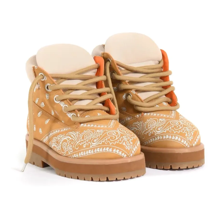 De PDF Strada Low Bandana Boot combineert een nubuck bovenwerk met een contrasterende all-over bandana print voor opvallende alledaagse winterkleding. Designer ID: DFM45012S0010PX. Belangrijkste kenmerken: Geel | Nubuck | Antislip rubberen zool | Vetersluiting aan de voorkant met metalen veterogen | Gewatteerde tong met siliconen logopatch | Laag uitgesneden gewatteerde kraag | Logo detail op de achterkant | Gekartelde rubberen zool | Ronde neus | All-over bandana print | Contrasterende print | Samenstelling & verzorging: Buitenkant: 100% leer (nubuck) | Voering: 100% stof | Zool: 100% rubber