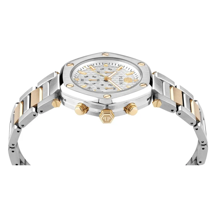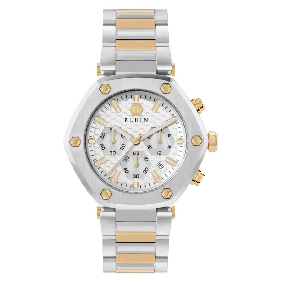 Ontdek de Philipp Plein Hexagon Chrono Horloge, een verfijnd uurwerk met een opvallend zilver- en goudkleurig roestvrijstalen design. Perfect voor elke gelegenheid, deze horloge combineert elegantie met functionaliteit. Belangrijkste kenmerken: Zilver | Goud | Multicolor | Roestvrij staal | Waterbestendig tot 5 ATM | Witte wijzerplaat | Zilver- en goudkleurige kast | Zilver- en goudkleurige armband | Samenstelling en onderhoud: Reinig met een zachte doek