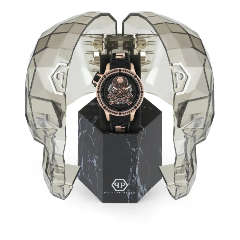 Geef je stijl een boost met de Philipp Plein Plein Rich 46mm Horloge, een opvallend accessoire met een luxe IP roségouden kast en een gedurfde zwarte wijzerplaat. Belangrijkste kenmerken: Zwart | Roségoud | Roestvrij staal | Waterbestendig tot 5 ATM | Zwarte siliconen band | Bezel en schedel versierd met 189 kristallen | Samenstelling en onderhoud: Roestvrij staal | Siliconen | Reinig met een zachte doek