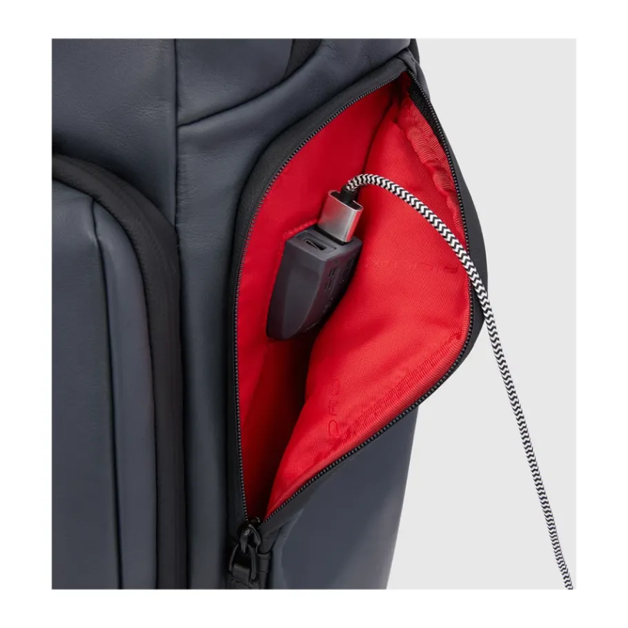 Fast-check, personalizable laptop and iPad® backpack in leather with CONNEQU, anti-theft cable, shock absorbing protection, USB and USB Type-C ports