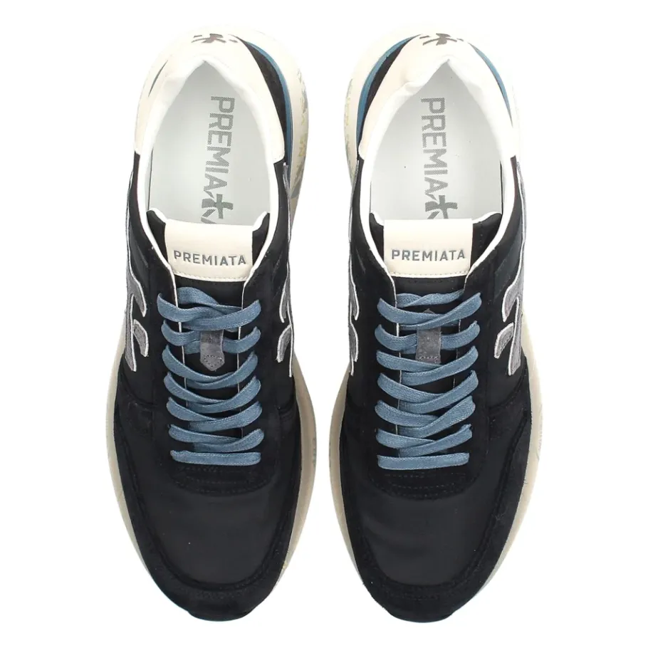 Upgrade je stijl met deze blauwe suède en nylon Mick sneakers van Premiata. Voorzien van een voorsluiting met veters, contrasterende merkhielkap, ronde neus en dikke rubberen zool met een hoogte van 4 cm.