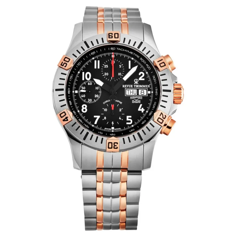 Ervaar precisie en stijl met de Revue Thommen Airspeed Xlarge Pioneer Chrono Horloge, met het bekende Valjoux 7750 uurwerk voor nauwkeurige tijdwaarneming. Belangrijkste kenmerken: Zwart | Roestvrij staal | Waterbestendig tot 10 ATM | Chronograaffunctie | Saffierglas | Bicolor roestvrijstalen armband | Zwarte wijzerplaat met lichtgevende coating |