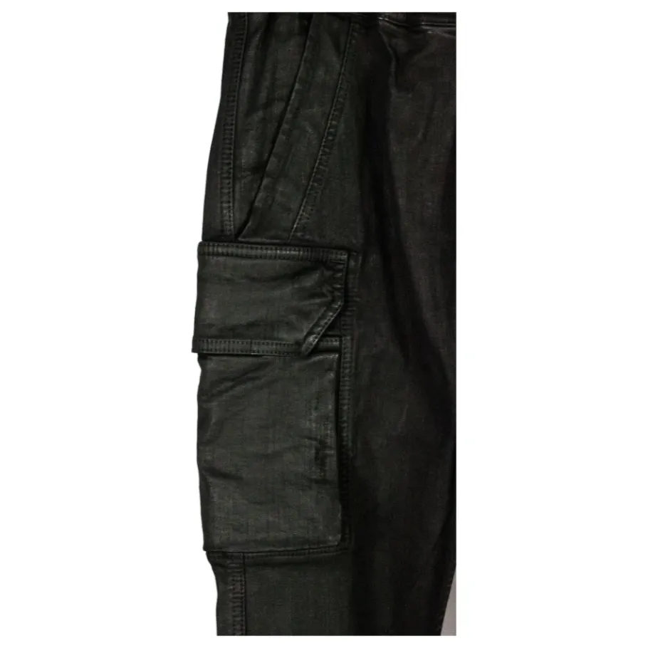 De Rick Owens Wax Stretch Denim Broek combineert een slank silhouet met een gewaxte denim finish en functionele zakken voor een gestructureerde, eigentijdse look. Belangrijkste kenmerken: Zwart | Denim | Stretch stof | Elastische tailleband met trekkoord | Elastische manchetten | Twee paspelzakken aan de zijkant | Twee cargozakken met ritssluiting | Achterzakken met kleppen | Gewaxte finish | Afgeschuinde zakflappen | Topstitching | Cargo-zakdetails op de buitenkant van het bovenbeen | Afmetingen en pasvorm: Slim fit