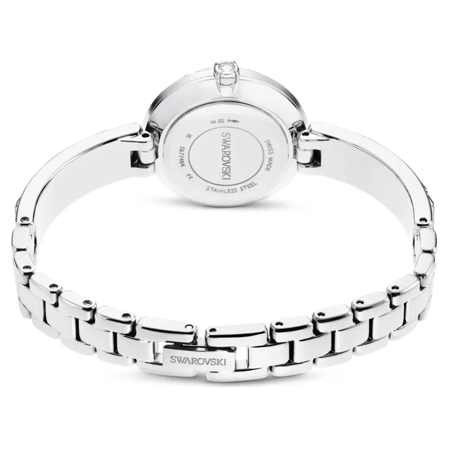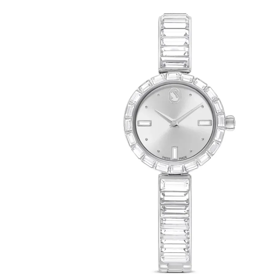 Upgrade je stijl met dit prachtige Swarovski-horloge. Vervaardigd van roestvrij staal en versierd met Baguette-kristallen, dit zilverkleurige horloge heeft een kast van 25 x 25 mm, 3 Baguette kristallen indexen en een Swarovski-zwaan om 12 uur. Het horloge is waterbestendig tot 50 meter en beschikt over Zwitsers quartz uurwerk. Maak een statement met de 20 Baguette kristallen lunet, kristal-gezette kroon en kristalbezette armband. Gemaakt in Zwitserland. Artikelnummer: 5677487.