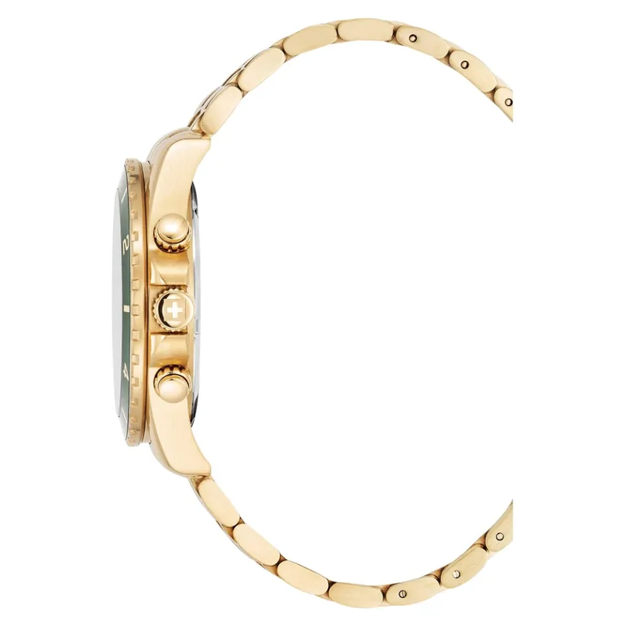 Swiss Alpine Military 7034.9114 Sierra is een robuust chronograaf horloge met een groene wijzerplaat en een gouden roestvrijstalen armband. Het combineert Zwitserse precisiekwaliteit met 10 ATM waterbestendigheid voor dagelijks gebruik en zwemmen. Belangrijkste kenmerken: Groen | Goud | Roestvrij staal | Waterbestendig 10 ATM | Swiss Made uurwerk | Chronograaf | Datumweergave | Uur-, minuut- en secondewijzers | Zwitsers quartz uurwerk | Groene wijzerplaat | Gouden roestvrijstalen armband | Gepolijste en geborstelde kastafwerking | Vouwsluiting | Gehard mineraalglas | Lichtgevende wijzers en indexen | Afmetingen & pasvorm: Kastbreedte: 43 mm | Kastdikte: 11 mm | Maximale polsomtrek: 210 mm | Samenstelling & onderhoud: Roestvrij staal | Gehard mineraalglas | Quartz uurwerk (Swiss Made) | Afnemen met een zachte doek. Vermijd chemicaliën en sterke schokken. Bedien de kroon of drukknoppen niet onder water.