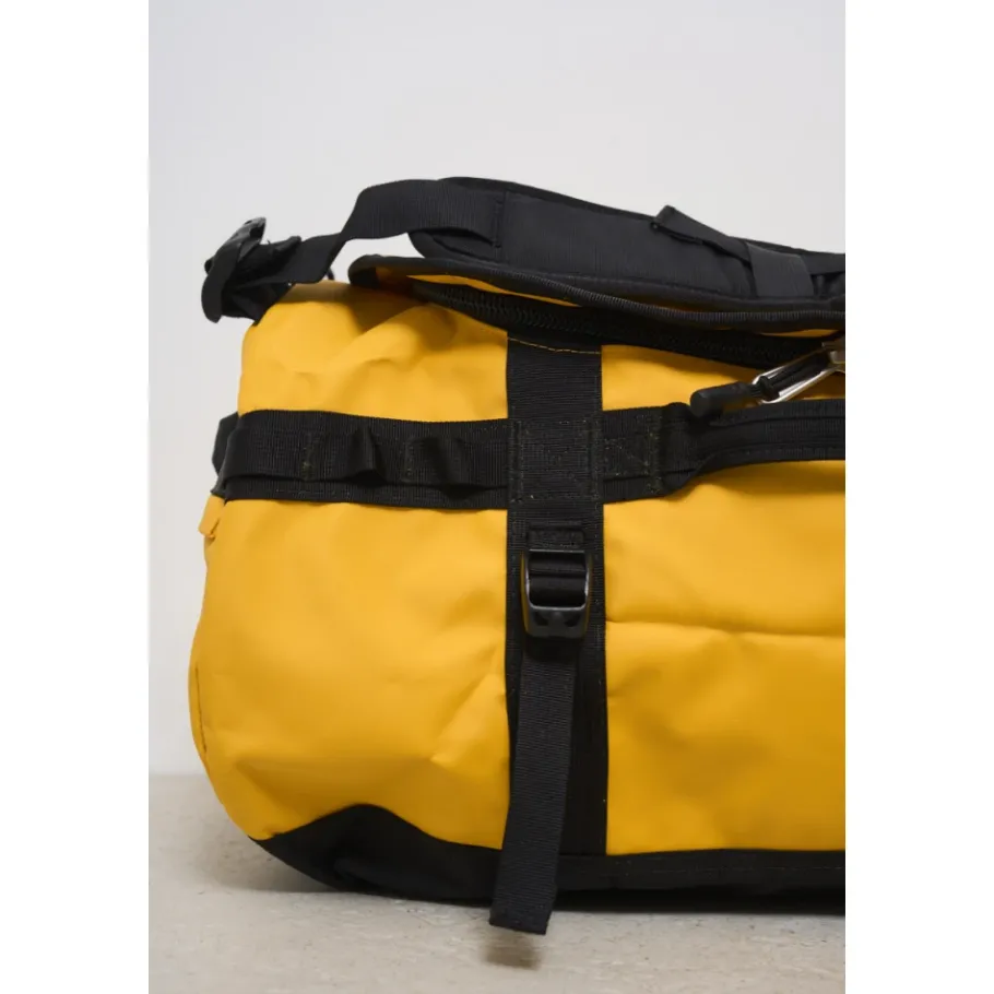 THE NORTH FACE Duffel Base Camp S geel. Alpenstijl, afneembare en verstelbare schouderbanden. Twee gewatteerde zijhandvatten voor hand- of schouderdragen. D-vormige ritssluiting met weerbestendige klep. Hoofdcompartiment met ritssluiting en mesh zak en eindzak. Waterbestendig. Vier compressieriemen. Transparante documentenzak bovenaan. Netzak helpt de duffel schoon te houden. Afmetingen: 33cm x 53cm x 33cm. Samenstelling: 100% polyester.