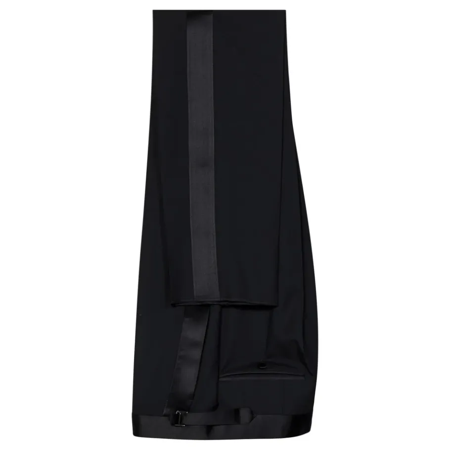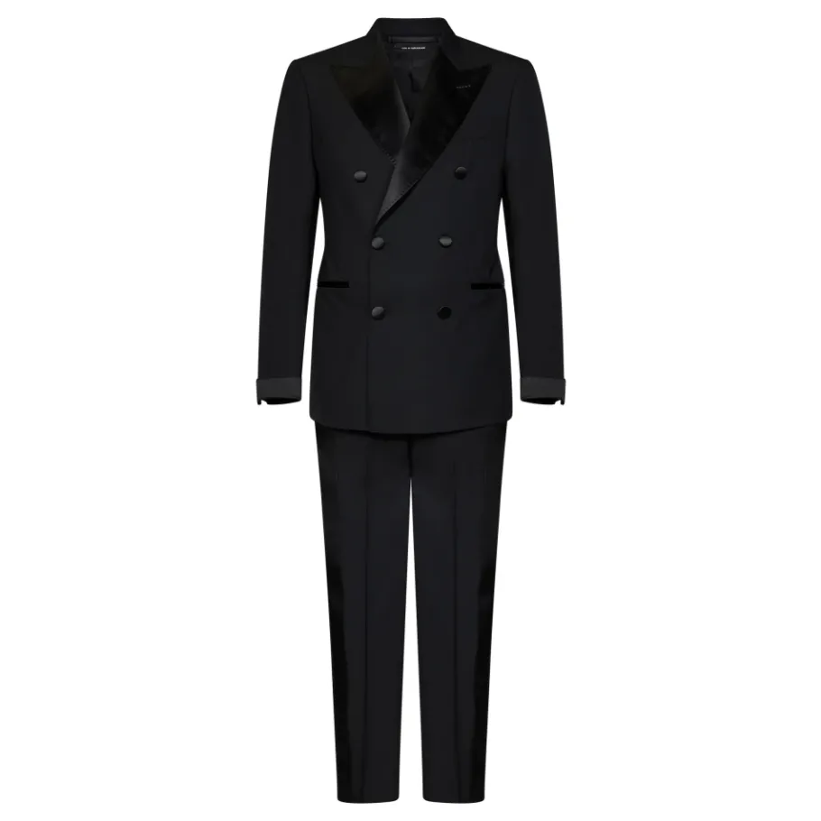 Upgrade je formele look met dit Tom Ford Single Breasted Suit. Het colbert heeft een dubbele rij van zes knopen, een satijnen piek revers en gestructureerde schouders, terwijl de broek is voorzien van een bedekte sluiting en satijnen tailleband. Gemaakt van 100% wol in Zwitserland, straalt dit zwarte pak verfijning en stijl uit. Verkrijgbaar in maat 48 IT.