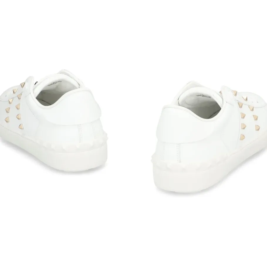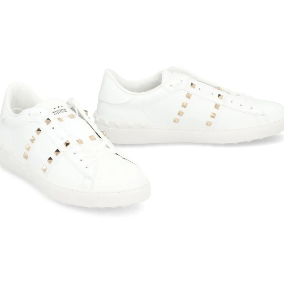 De Valentino Garavani Rockstud Untitled Sneakers combineren glad kalfsleer met de kenmerkende piramidestuds van het label voor een verfijnde alledaagse sneaker. Belangrijkste kenmerken: Wit | Kalfsleer | Vetersluiting | Gewatteerde enkel | Rubberen zool | Decoratieve goudkleurige metalen studs | Ronde neus | Laag model | Kenmerkende Rockstud-details | Afmetingen en pasvorm: Valt normaal qua maat — neem je normale maat | Samenstelling en verzorging: Buitenkant: 100% kalf | Binnenkant: 100% leer | Zool: 100% rubber