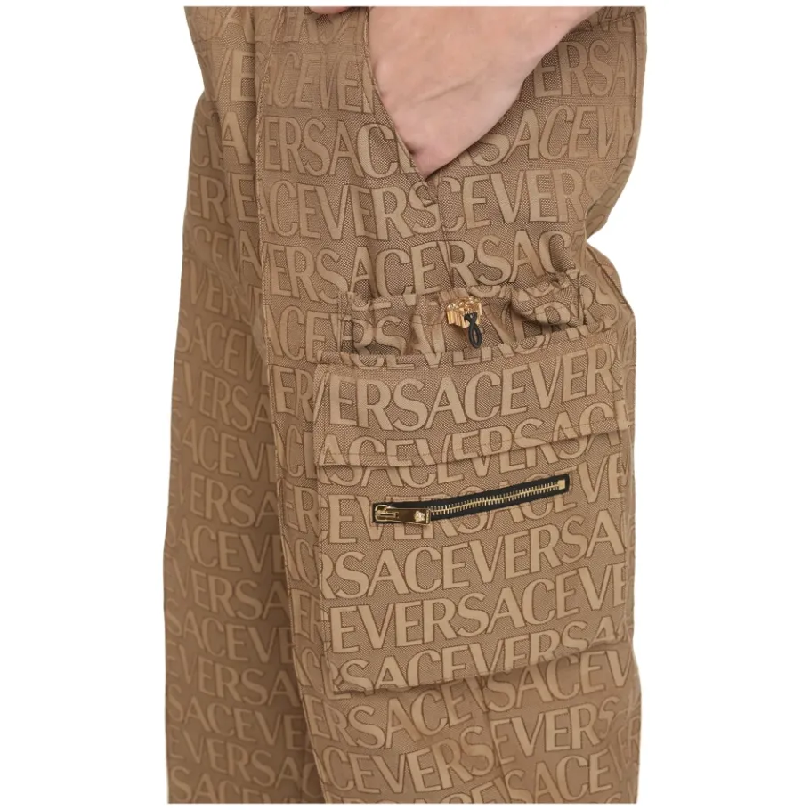 De Versace Allover Cargo Broek combineert een kenmerkend all-over logo motief met praktische cargo details. Ze bieden een balans tussen een opvallend design en dagelijks gebruiksgemak voor een verfijnde casual look. Belangrijkste kenmerken: Beige | Polyester | Elastische enkelboorden | Elastische tailleband | Cargo zakken | Knoop- en ritssluiting | Goudkleurige metalen hardware | All-over logo motief | Logo jacquard | Rechte pijp | Afmetingen & pasvorm: Mid rise | Valt normaal qua maat | Samenstelling & verzorging: 60% Polyester | 40% Katoen | Handwas