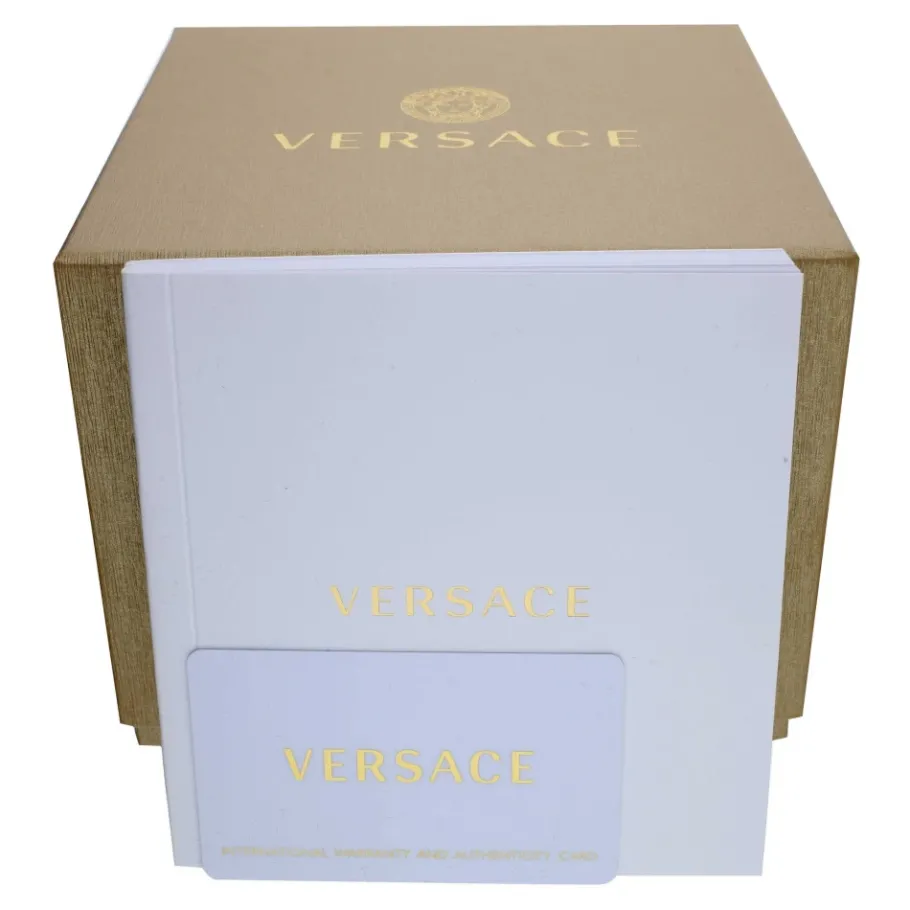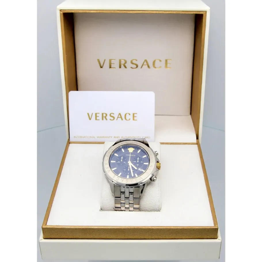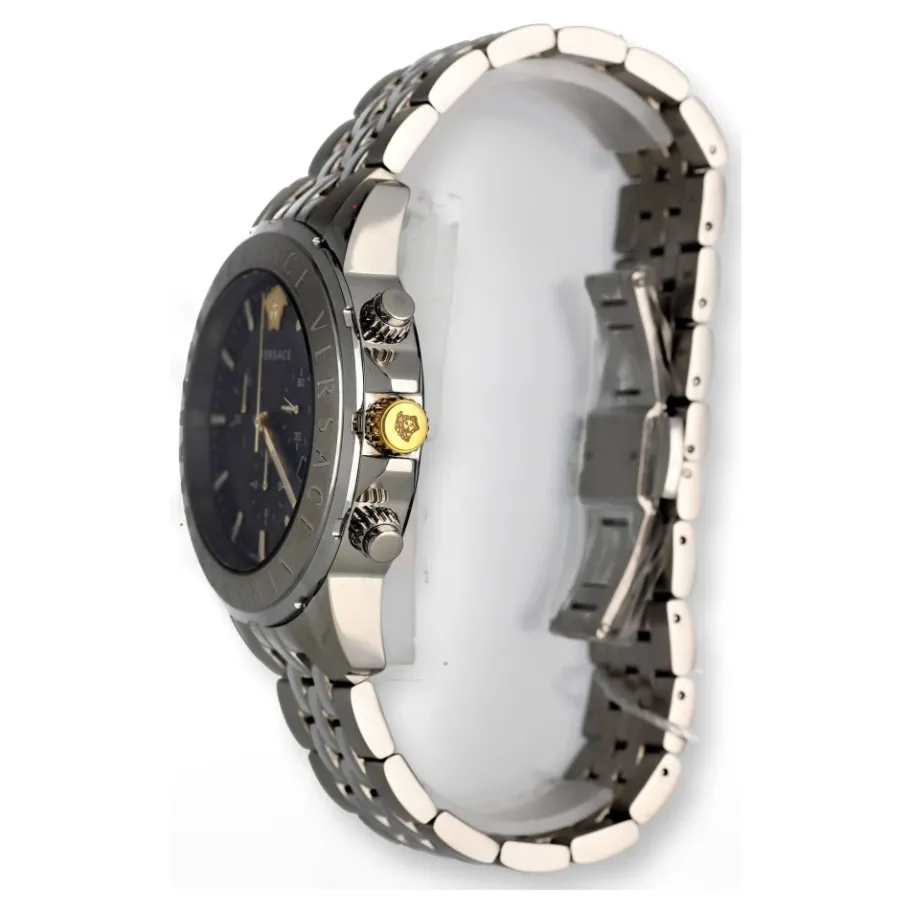 Upgrade je stijl met dit strakke Versace herenhorloge. Voorzien van een analoge display met datum, chronograaf en lichtgevende wijzers en indexen. Gemaakt in Zwitserland met een quartz uurwerk en saffierglas. De roestvrijstalen kast in zilver herbergt een zwarte wijzerplaat, 44 mm breed en 12 mm dik. Afgewerkt met een roestvrijstalen band en vouwsluiting. Waterbestendig tot 5 bar.