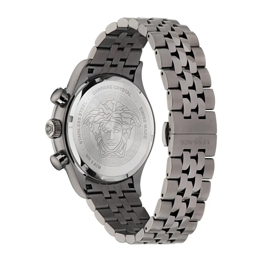 Ontdek de Versace VE2U00722 HELLENYIUM CHRONO horloge voor heren, een Swiss Made horloge met een strakke grijze roestvrijstalen armband en een opvallende blauwe wijzerplaat. Dit chronograaf horloge heeft een multifunctioneel display, stopwatch functie en kalenderdatum. Met een kastgrootte van 44 mm, bandbreedte van 22 mm en waterbestendigheid tot 5 ATM, is dit Versace horloge zowel stijlvol als functioneel.