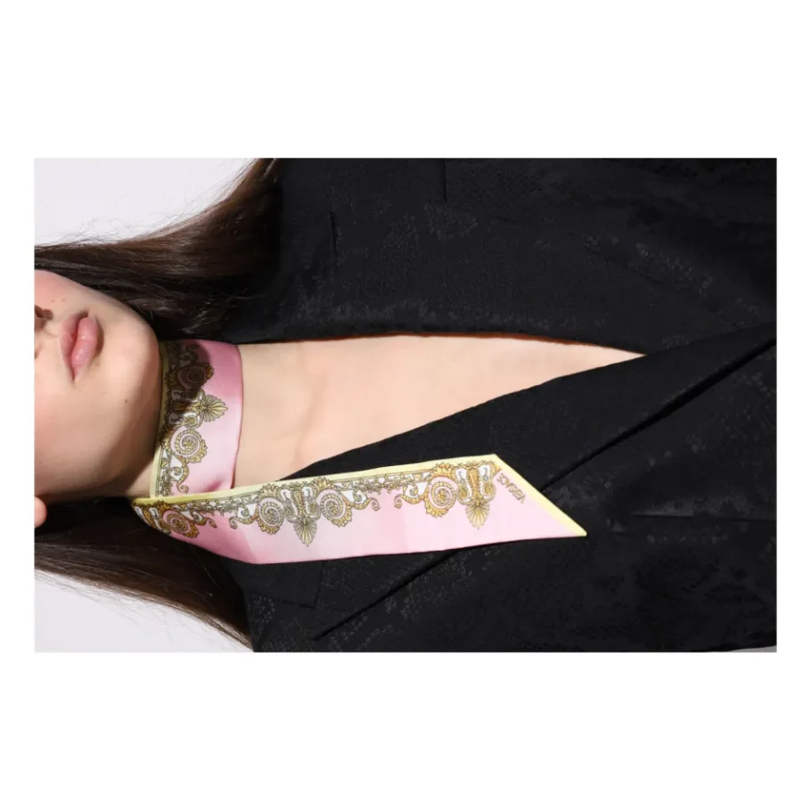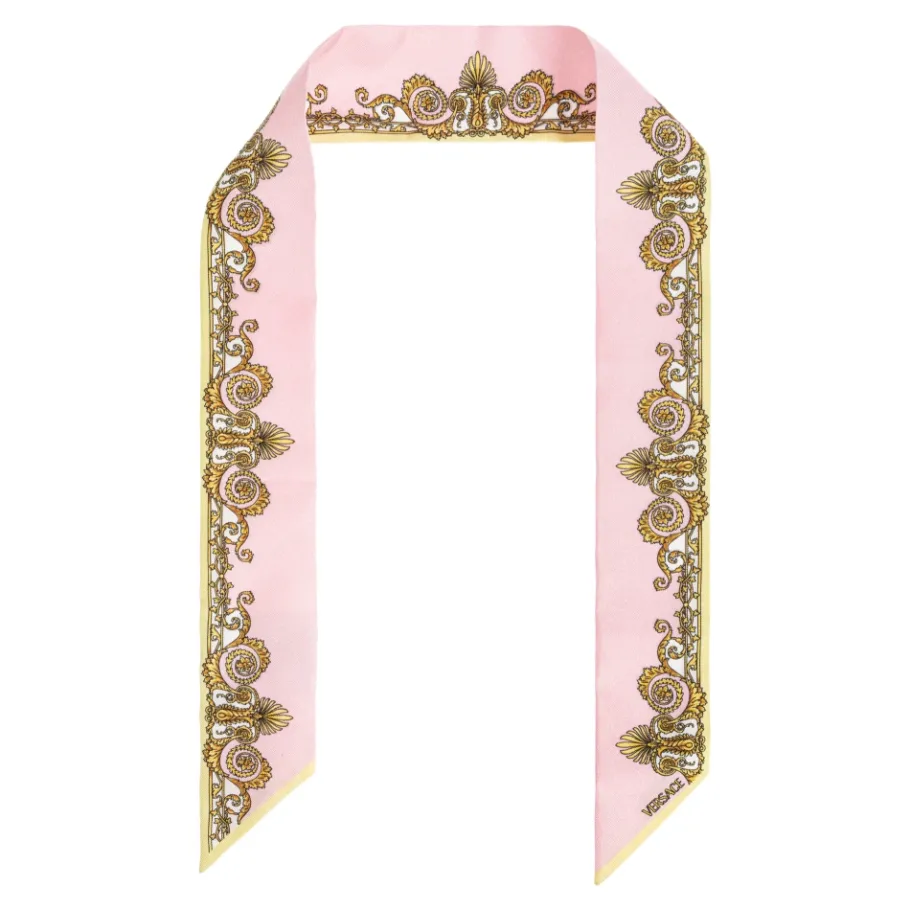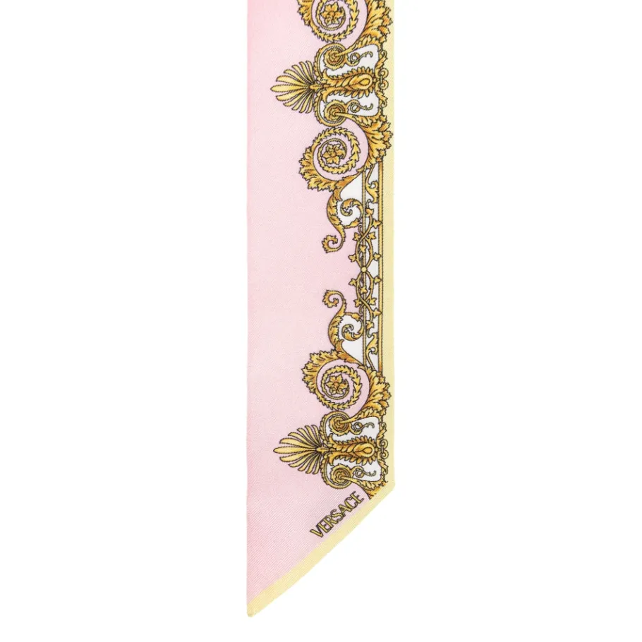 De Versace Geprinte Zijden Twill Lavallière is een lange, smalle zijden sjaal die een kenmerkend barokmotief combineert met veelzijdige styling. Draag hem om de hals, knoop hem aan een handtas of gebruik hem als haaraccessoire voor een gepolijste afwerking. Belangrijkste kenmerken: Roze | Zijde | Zacht handgevoel | Glanzende, edele glans | Kan om de hals, pols, tas of in het haar worden geknoopt | Veelzijdige stylingopties | Lange, smalle vorm met geometrische uiteinden | Barokprint met gouden en bruine ornamenten | Subtiel Versace-logo op één hoek | Afmetingen & pasvorm: Hoogte: 84 cm | Breedte: 5 cm | Samenstelling & onderhoud: 100% Zijde | Professionele stomerij aanbevolen; volg het waslabel van het product.