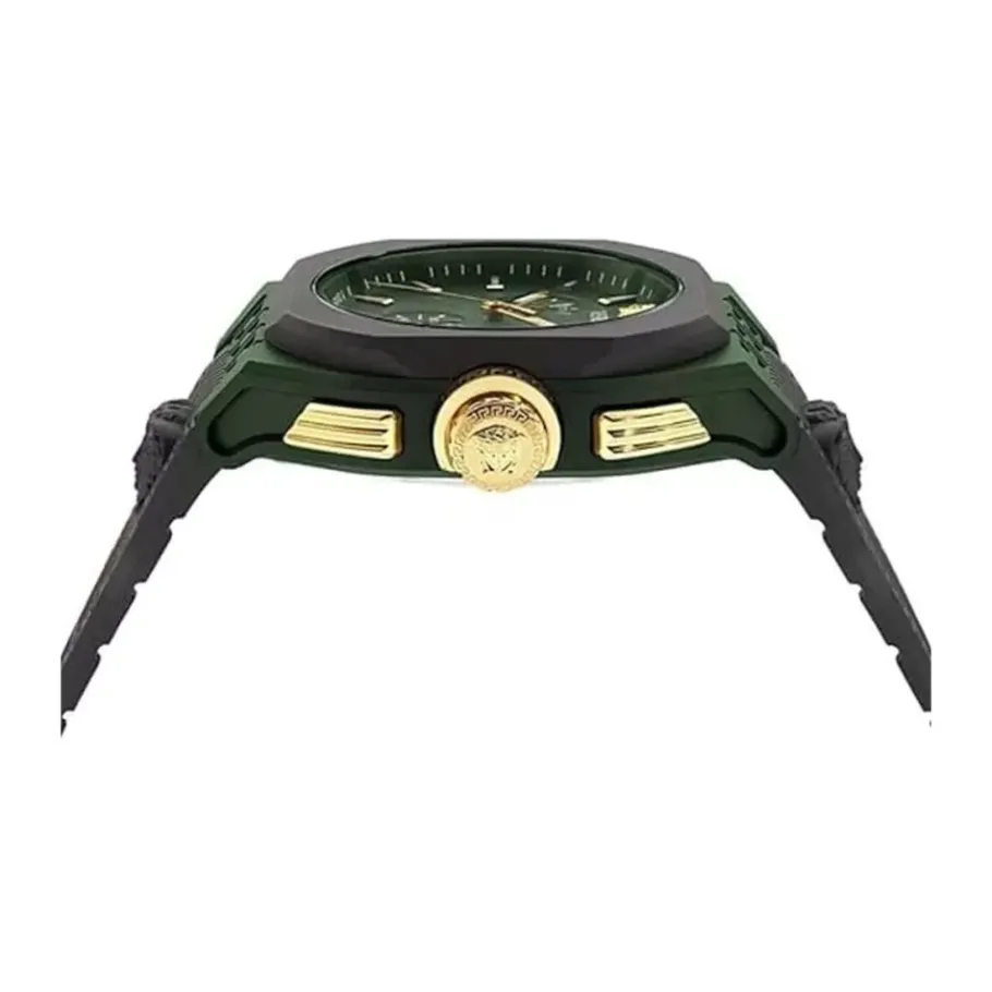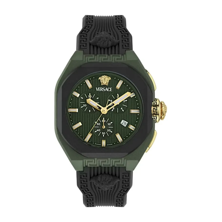 De Versace V-Legend Chronograph combineert een gedurfde groene guilloché wijzerplaat met een keramische kast voor een verfijnde alledaagse chronograaf. Het quartz chronograaf uurwerk en de waterbestendigheid van 5 ATM maken hem geschikt voor dagelijks gebruik. Belangrijkste kenmerken: Groen | Keramiek | Waterbestendig tot 5 ATM | Saffierkristalglas | Chronograaf | Datumweergave | Quartz uurwerk | Hoekige kast | Guilloche wijzerplaat | Afmetingen & pasvorm: Kast: 44 × 52 mm | Samenstelling & verzorging: Kast: Keramiek | Band: Plastic | Glas: Saffierkristal | Uurwerk: Quartz (chronograaf)
