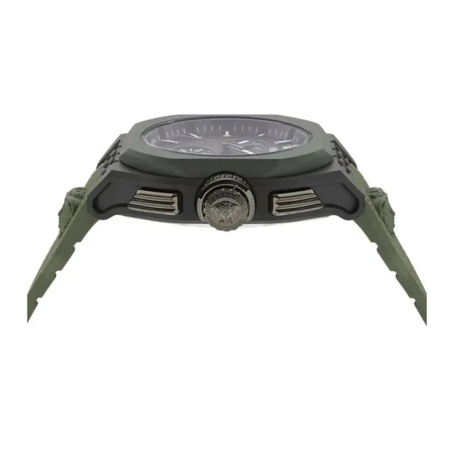 De Versace V-Legend Chronograph combineert een rechthoekige keramische kast met een zwarte wijzerplaat en een groene band voor een gedurfde, sportieve look. Het combineert chronograaffunctie met een saffierglas voor dagelijkse duurzaamheid. Belangrijkste kenmerken: Groen | Zwart | Keramiek | Waterbestendig tot 5 ATM | Saffierglas (krasbestendig) | Chronograaf | Datumweergave | Quartz uurwerk | Rechthoekige kast | Chronograaf met drie subdials | Datumvenster | Afmetingen & pasvorm: Kast: 44 × 52 mm | Samenstelling & onderhoud: Keramische kast | Saffierglas | Polyurethaan band | Reinig met een zachte doek. Vermijd contact met chemicaliën. Bedien de chronograaffuncties niet onder water; neem de waterbestendigheidslimiet van 5 ATM in acht.
